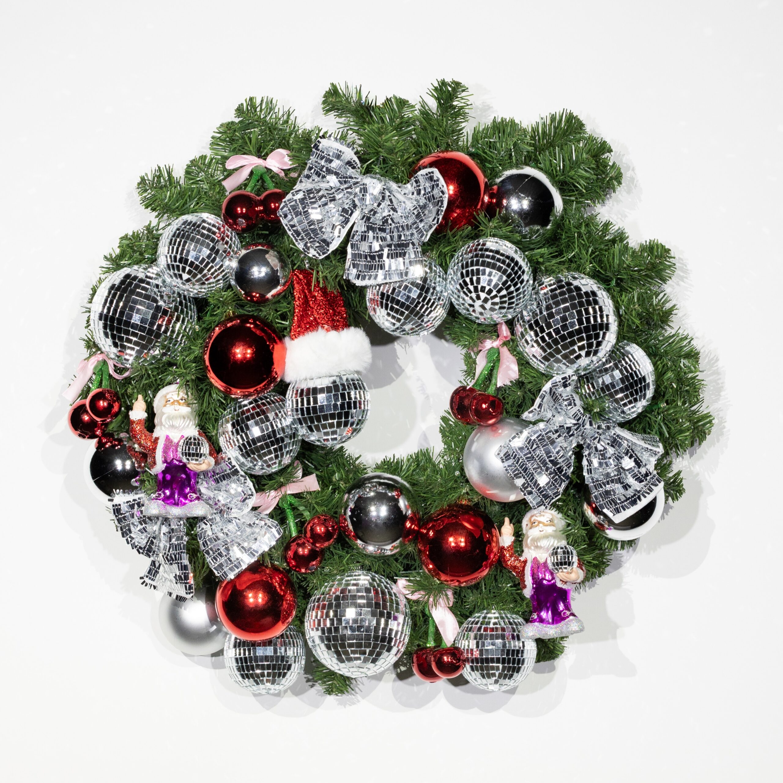 Description The Disco Wonderland wreath.Get ready to boogie through the holidays with The Disco Wonderland wreath! Featuring sparkling disco ball baubles and a playful Santa holding a disco bauble, this wreath brings a retro, fun-loving vibe to your seasonal décor. Perfect for adding sparkle, personality, and a touch of whimsy to your door, mantel, or as a show-stopping gift, it’s a celebration of holiday cheer like no other.