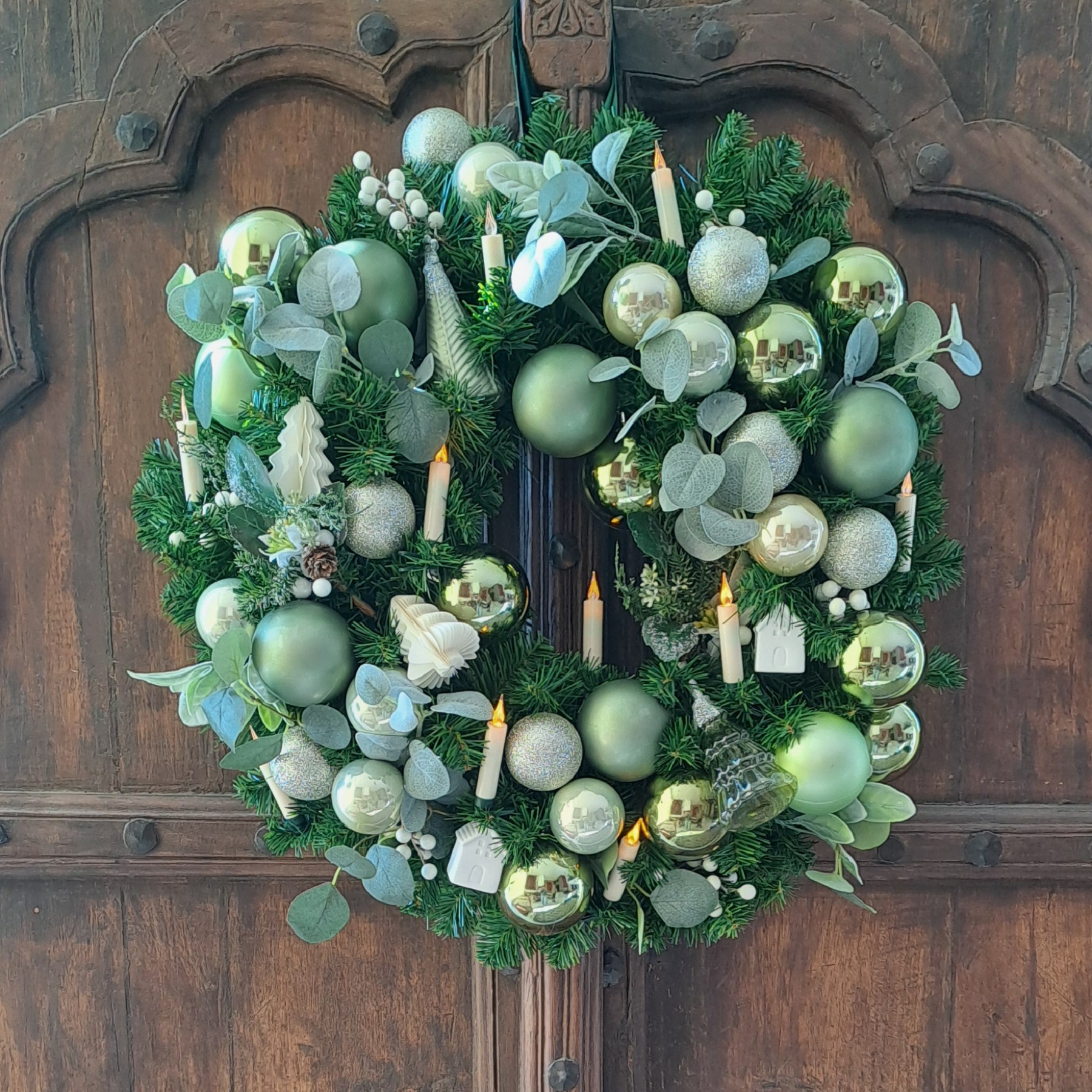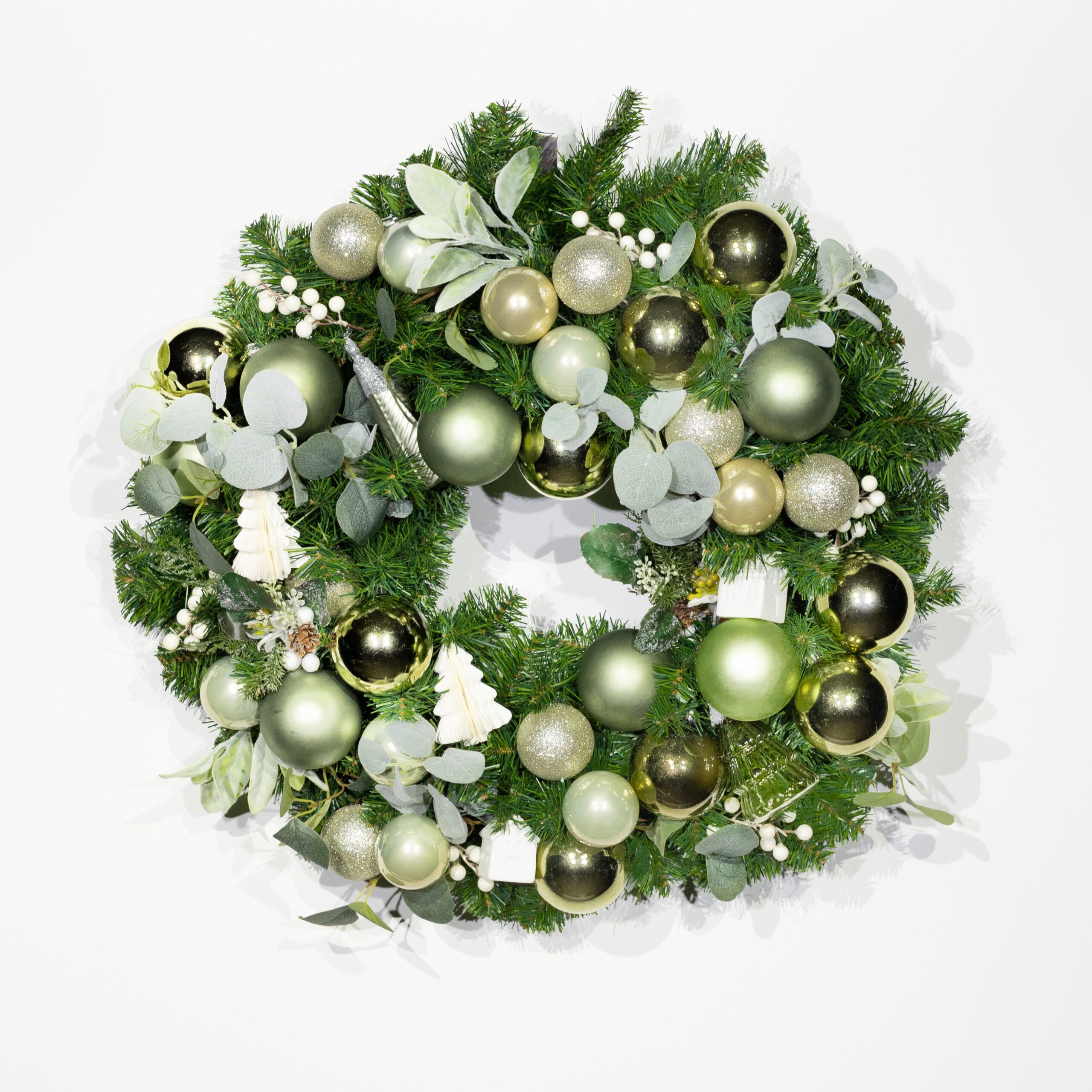 Description The Winter Garden wreath. Bring the serene beauty of nature indoors with The Winter Garden Wreath. Featuring lush greenery accented with green, natural-looking baubles, this wreath evokes a fresh, garden-inspired aesthetic perfect for the winter season. Its understated elegance makes it a versatile and timeless festive decoration.