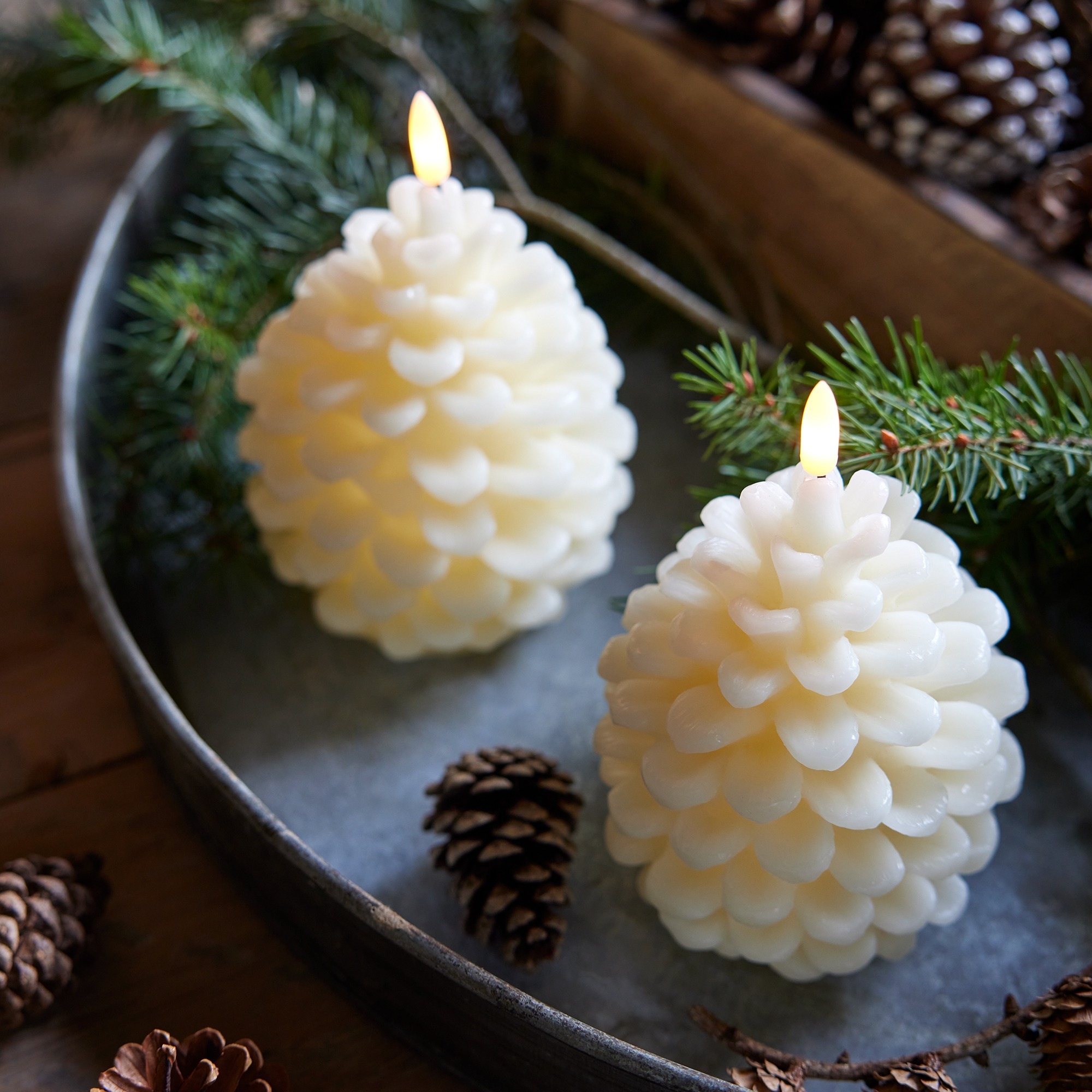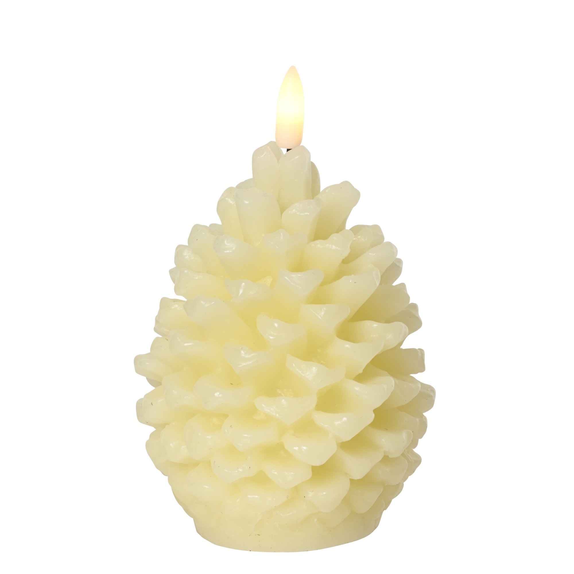 Description Pinecone-shaped LED candle with steady wick effect flame. Warm white. Battery operated with timer.Bring a warm, festive glow to your home with our Pinecone-Shaped LED Candle. Designed to resemble a classic holiday tree, this candle creates a cozy ambiance without the worry of an open flame. Perfect for mantels, tabletops, or as part of a centerpiece, it’s a safe and stylish way to add holiday charm to any space.